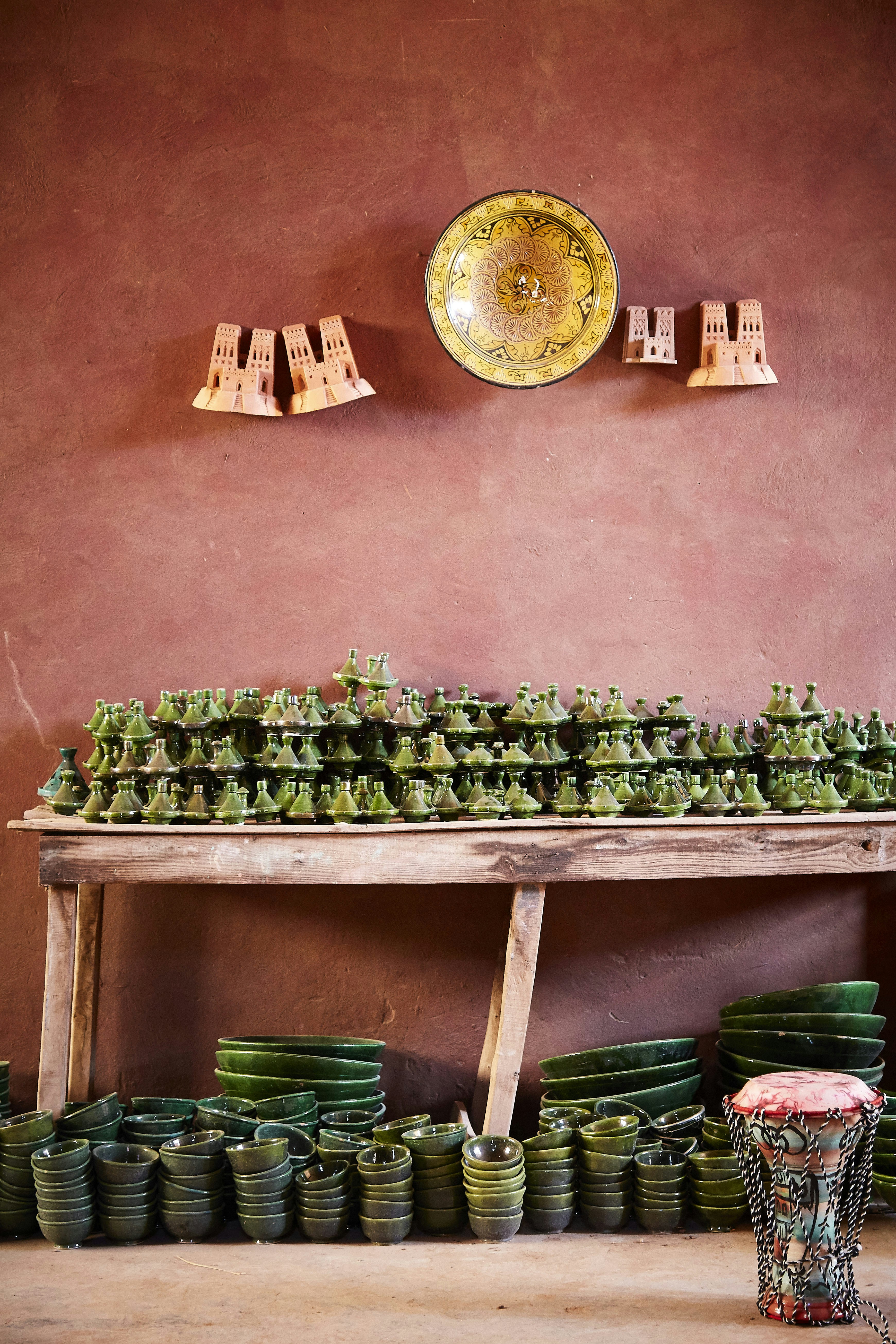 Typical tajine dish exposed into a shop in Zagora, Morocco. I was amazed by the lovely contrast of colors brought by the olive green tajine and the washed red walls.